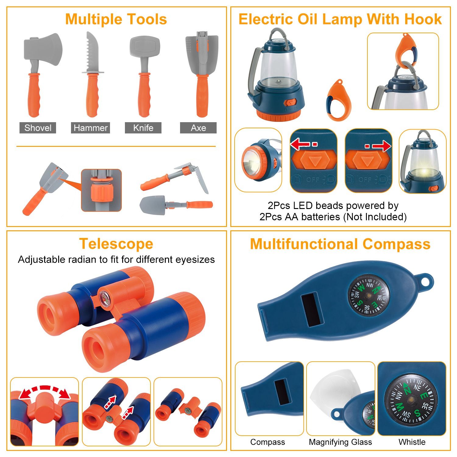 *56Pcs Complete Camping Kit*:Upgraded 56pcs kids camping kit has much more complete accessories,mainly including 1x Foldable Tent,1x Multifunctional Carpet,1x Telescope,1x Oil Lamp,multiple pieces of survival tools,kitchenwares,insects and so on. You can know about the detailed accessories in the package contents. Purchase our camping gear tools to encourage your kids to start their first camping adventure in the house or backyard.