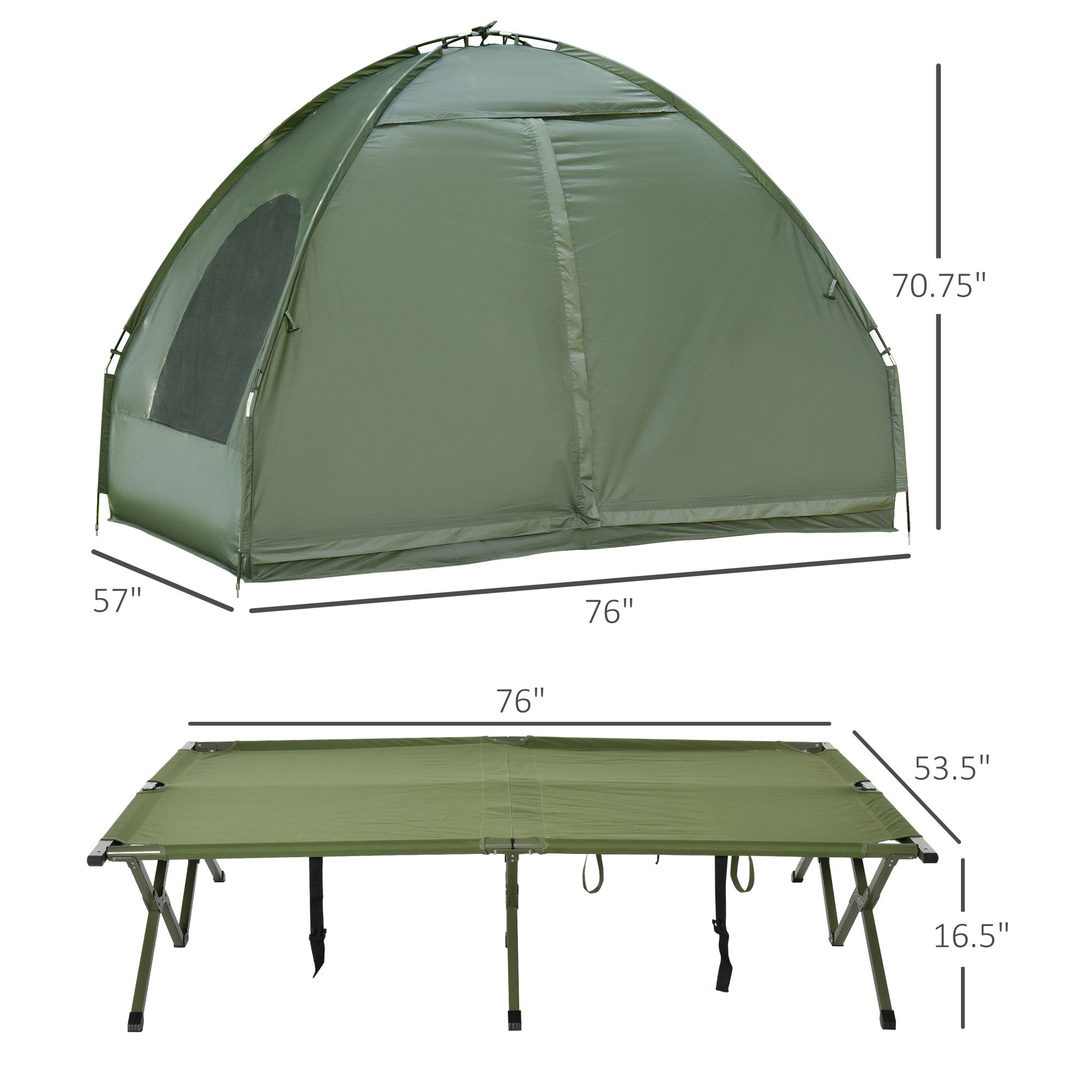 • - Solid Construction: This tent cot combo is made with fiberglass poles, 190T polyester taffeta, and Oxford fabric with PVC coating. The tent beds for camping can support up to 352 lbs.